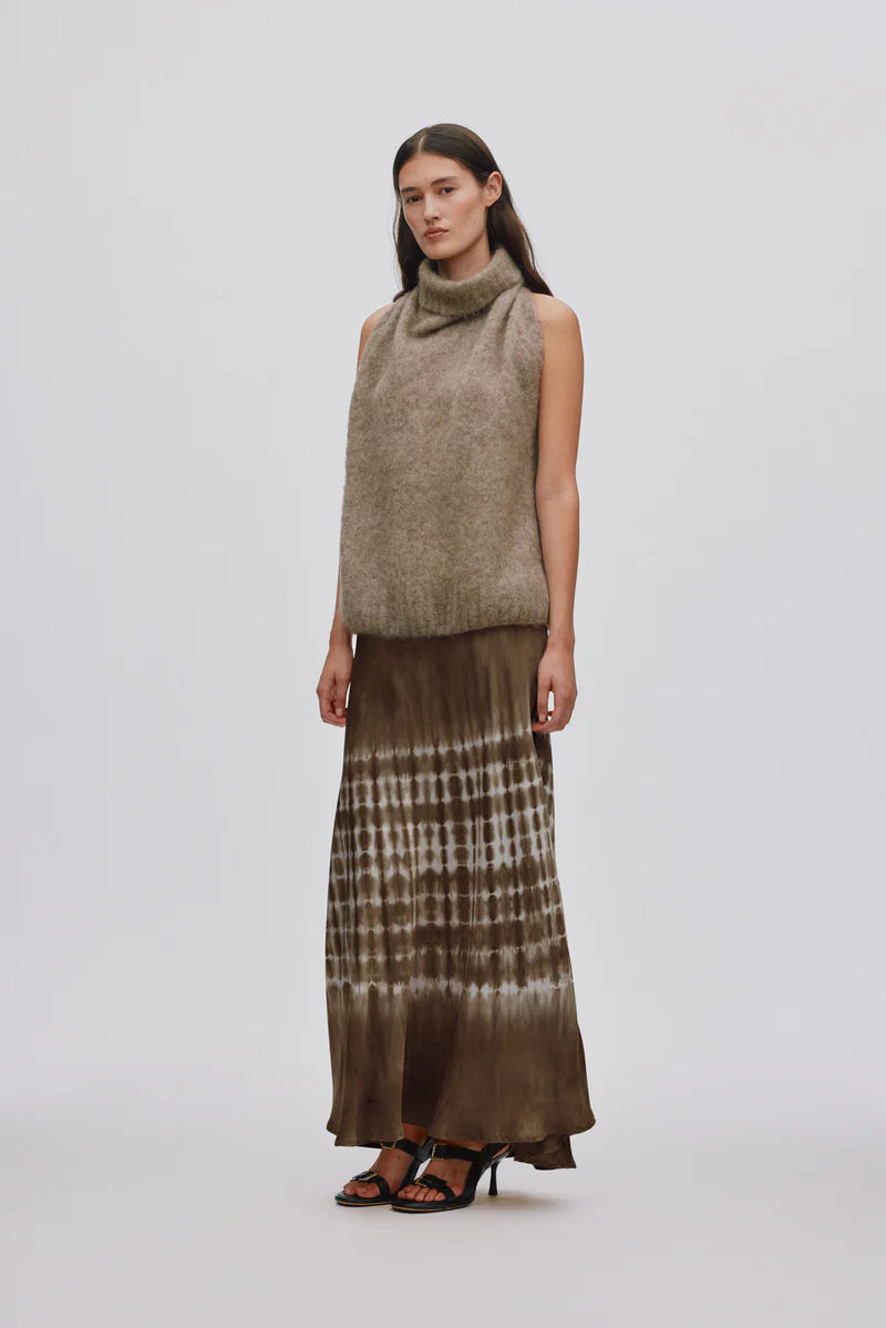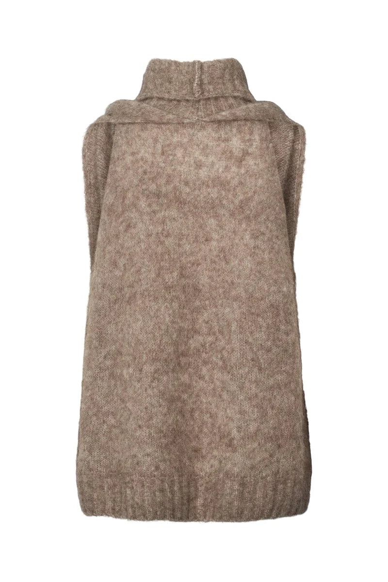 The design features a relaxed sleeveless silhouette with a turtleneck, bare shoulders, and a feminine back. The top can be styled with bare or covered shoulders. Wear it as a top or layered over a long-sleeved blouse.