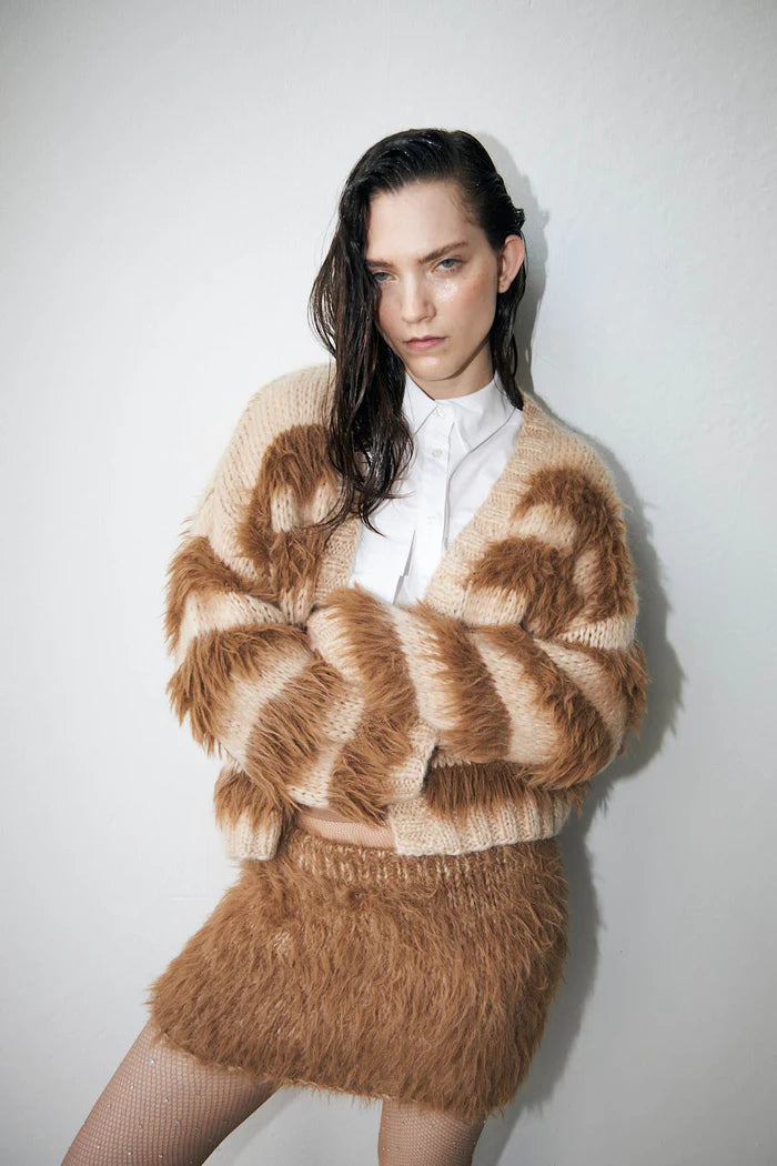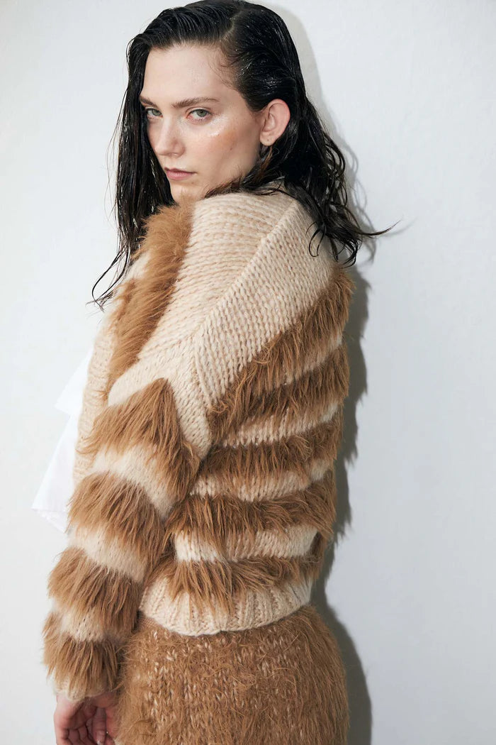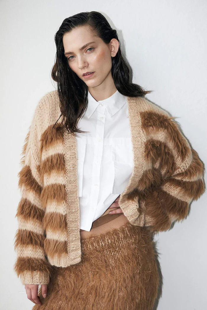 BABETTE is a hand knitted cardigan with soft, fur-like stripes and a voluminous silhouette. The knit features a mohair-fur surface that gives it a plush texture with rich depth and contrast between the colors. Designed with an open front and relaxed shape, it balances statement and softness in one piece.