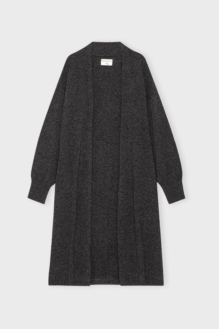 The cardigan is long and open with a decorative rib edge at the hem and cuffs. Notice the slightly voluminous sleeves.