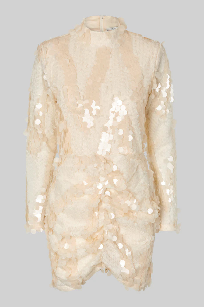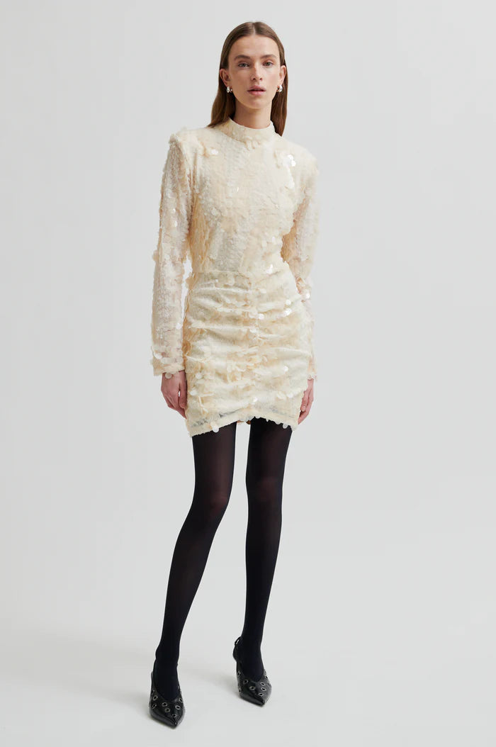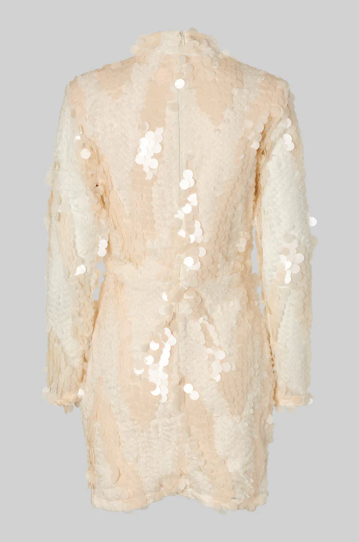 Second Female sequin dress. The dress combines sparkly sequins and sheer 3D fabric on a tonal mesh background. Featuring a high neck and zip fastening at the back. Gathered seam at front. Shoulder pads and long sleeves.