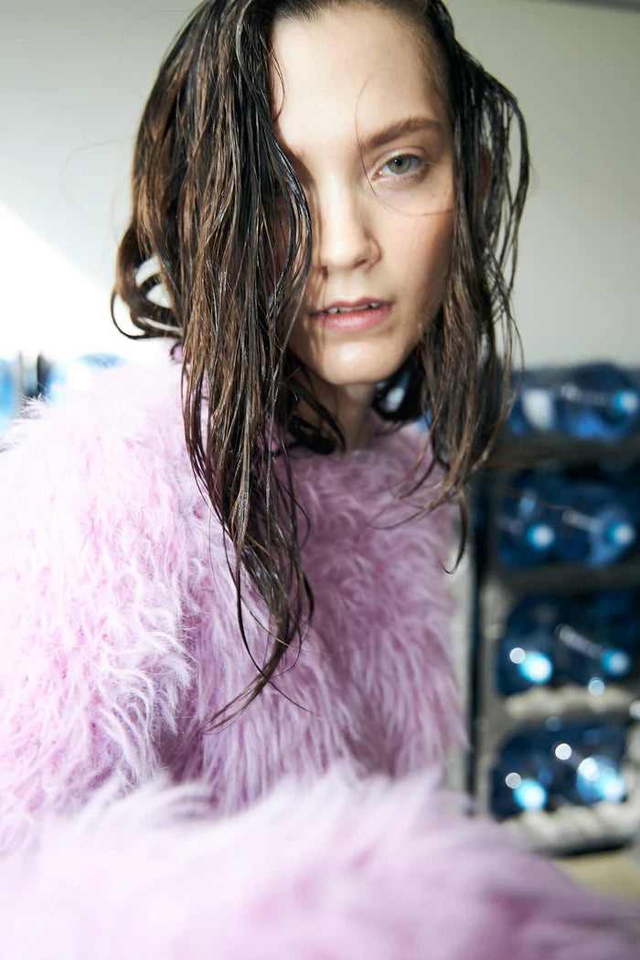 BABS is a hand knitted sweater with a round neckline, straight silhouette and soft volume. The knit has a mohair-fur surface that gives it a soft, luxurious and plush look.