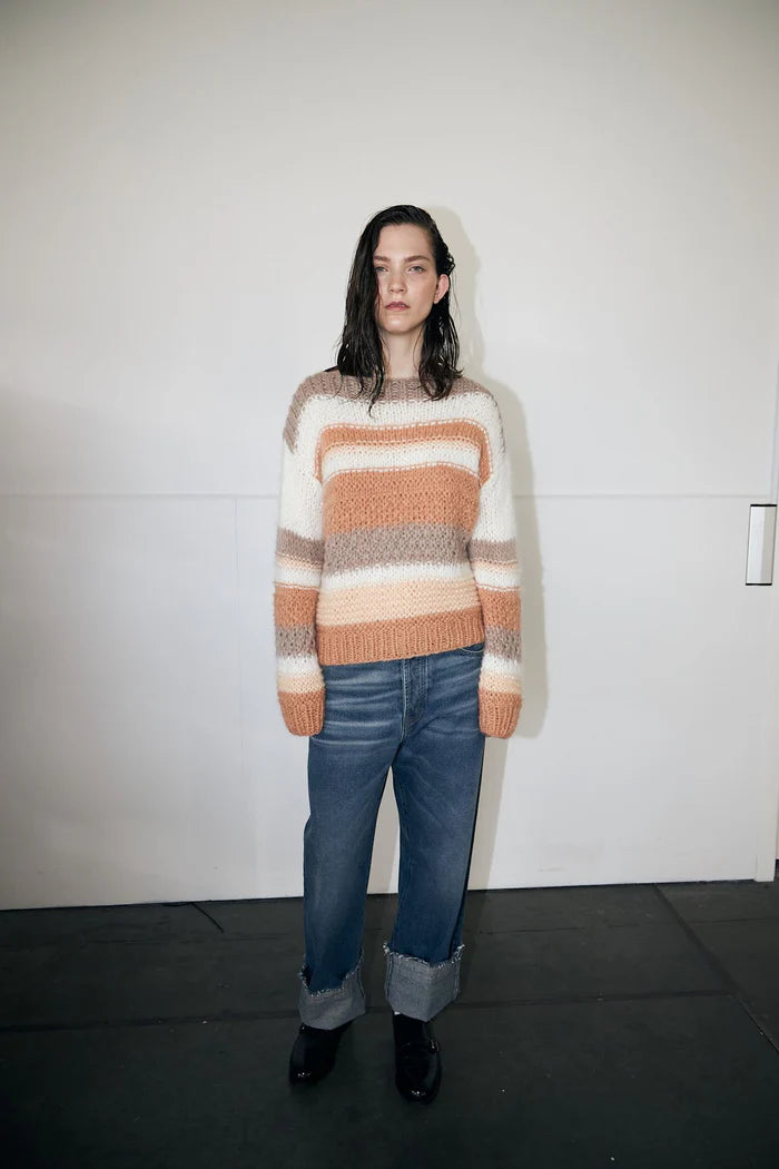 FILUCA is a hand knitted sweater with colorful horizontal stripes and a softly structured silhouette. Designed with a round neckline and long sleeves,