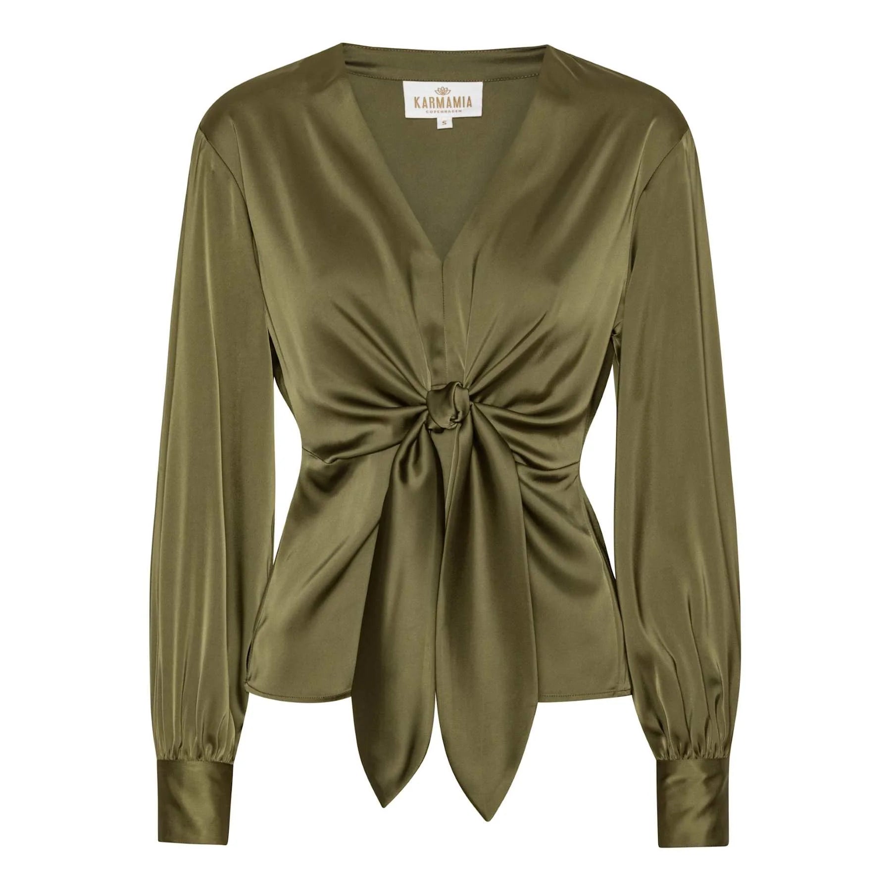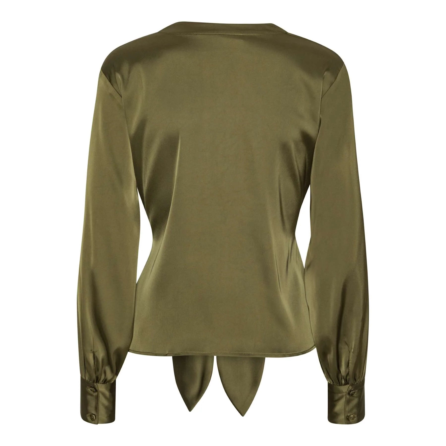 V-neck self-tie blouse in semi rich satin.