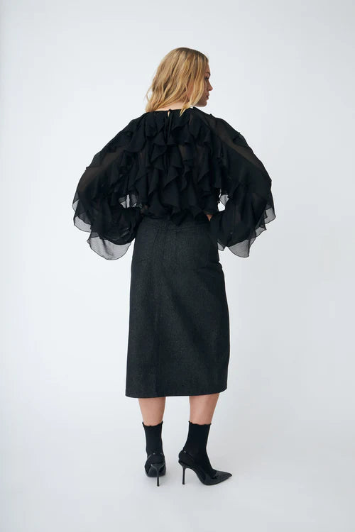 The Ryacras Blouse perfectly blends romance and modern femininity. Its delicate sheer fabric gives a light, airy look, while the beautiful ruffle details and fabric-covered buttons add an exclusive touch.