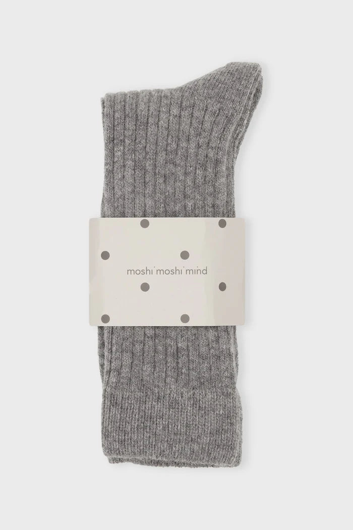 Medium-length, soft wool socks in grey rib knit. The socks are available in several colors.
