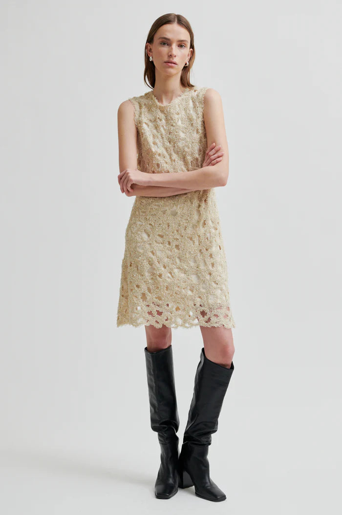Second Female beaded dress. The dress combines a structured pattern with shiny beads on a tonal background lining. Featuring a round neck and keyhole opening with button fastening at the back.